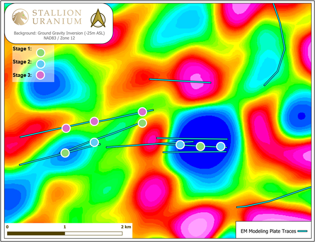 The 2026 winter drill program is expected to complete approximately six to eight drill holes targeting gravity low anomalies spatially associated with conductive corridors interpreted to represent graphitic structural zones with potential for uranium alteration. Targeting is focused on areas of interpreted structural complexity, including bends, offsets, and breaks in conductive rocks that may provide favourable pathways for uranium-bearing hydrothermal fluids.